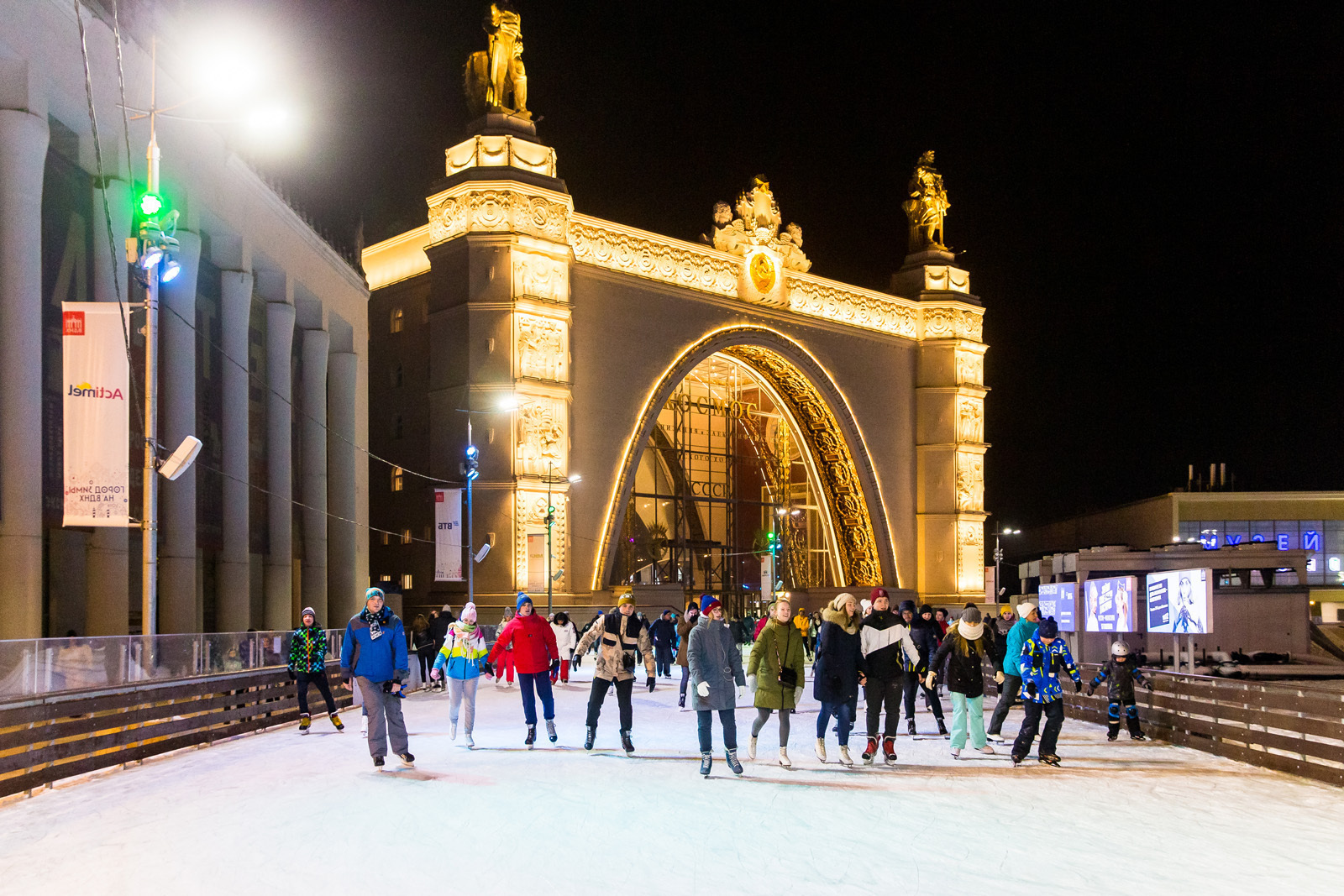 Арка Главного входа встречает виртуальных гостей порталом, украшенным световыми инсталляциями, а Центральная аллея, словно светящаяся река, ведет к новогодней елке Выставки.