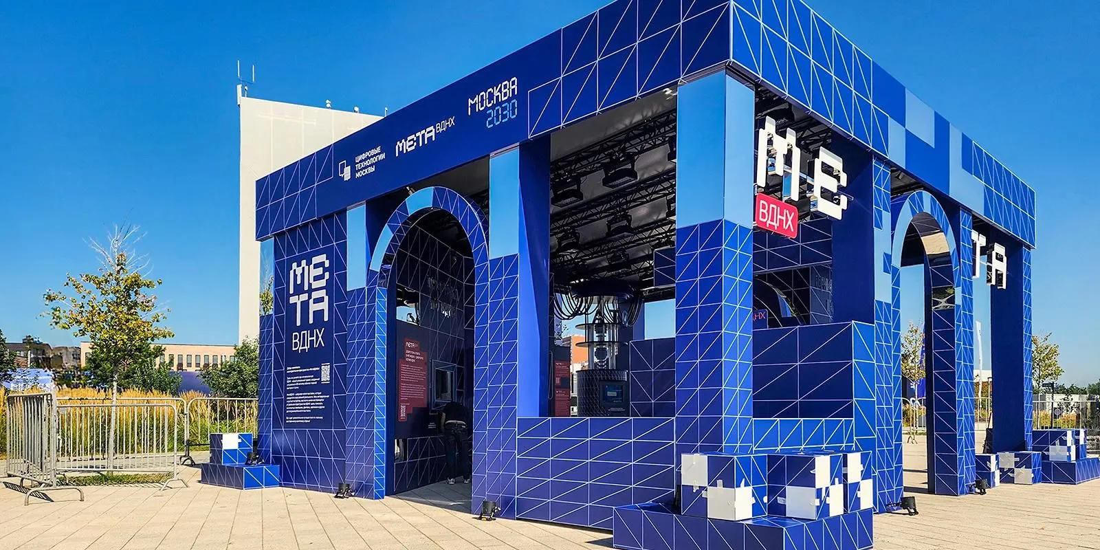 Интерактивное пространство «МетаВДНХ» стало физическим воплощением виртуальной копии выставки. Дизайн инсталляции сочетает грани 3D-макета и узнаваемые архитектурные элементы павильонов. Внутри гостей ждут интерактивные экспонаты, которые позволят больше узнать о метавселенной и других важных цифровых проектах Москвы.
